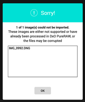 Also, PureRAW drew a blank on Apple ProRaw from my iPhone 12 Pro Max, which is a major miss. Adobe Camera Raw recognizes those files. I feel sure DxO will have updates to add these formats, but I was disappointed I could not get the advantage of PureRAW on those images. When I tried to load the iPhone images or a Skydio 2 drone image, PureRAW threw up this error: